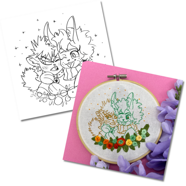 Hand embroidered hoops of lineart busts with multicolored pin-wheel flowers added to frame the characters. The default color of the lineart is black while the colors of the flowers a picked based on the color palettes of the characters. Requests for different colors can be made for lineart and flowers for no additional cost.