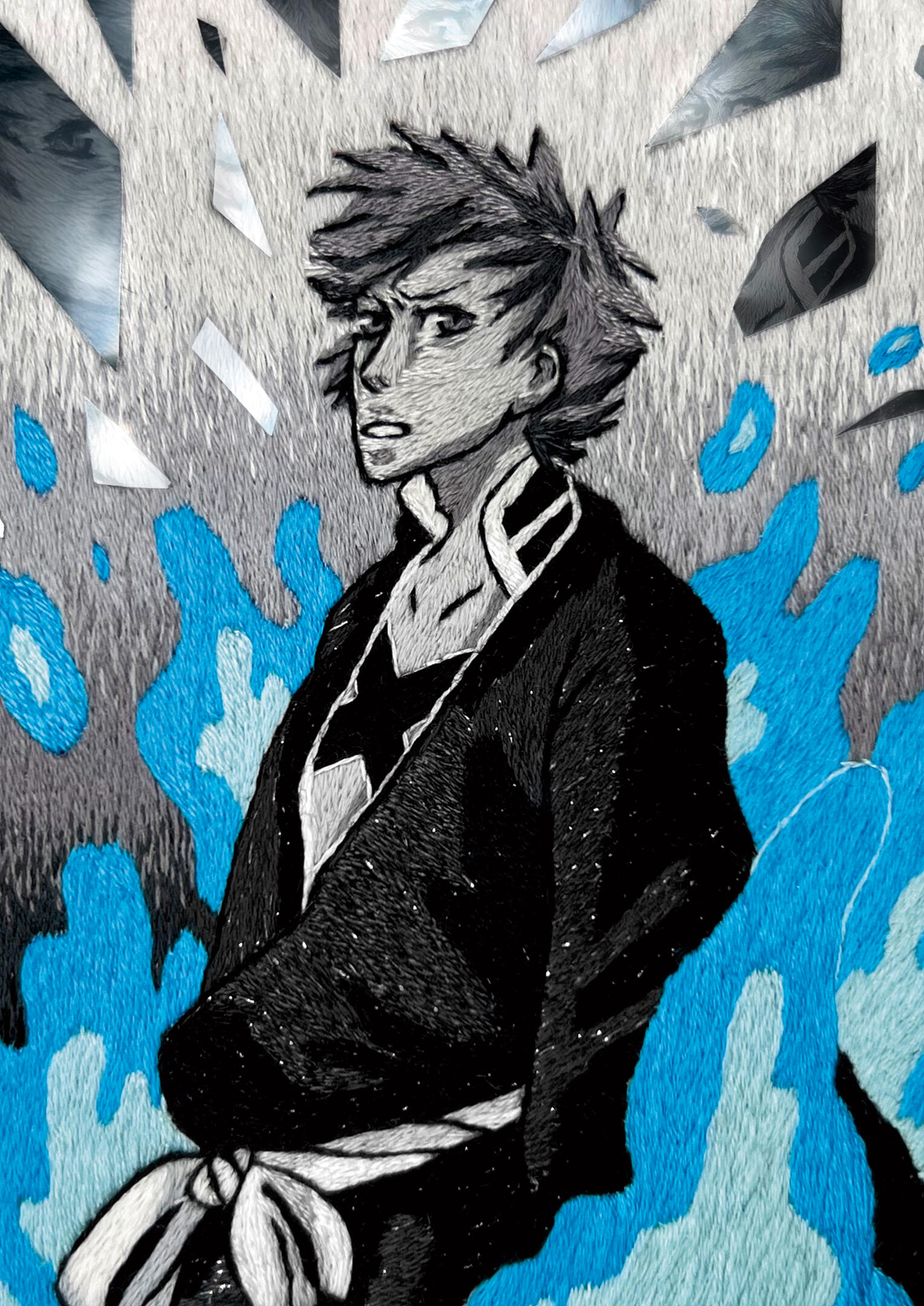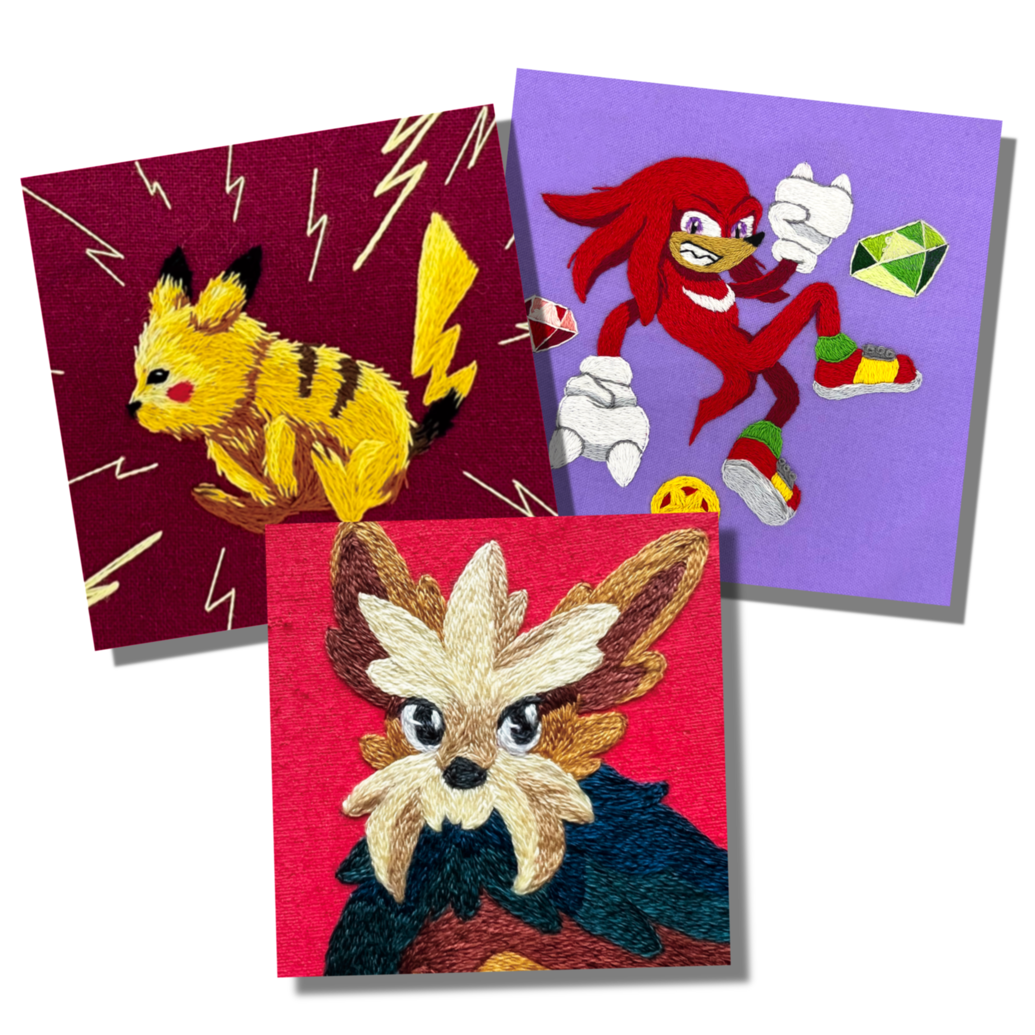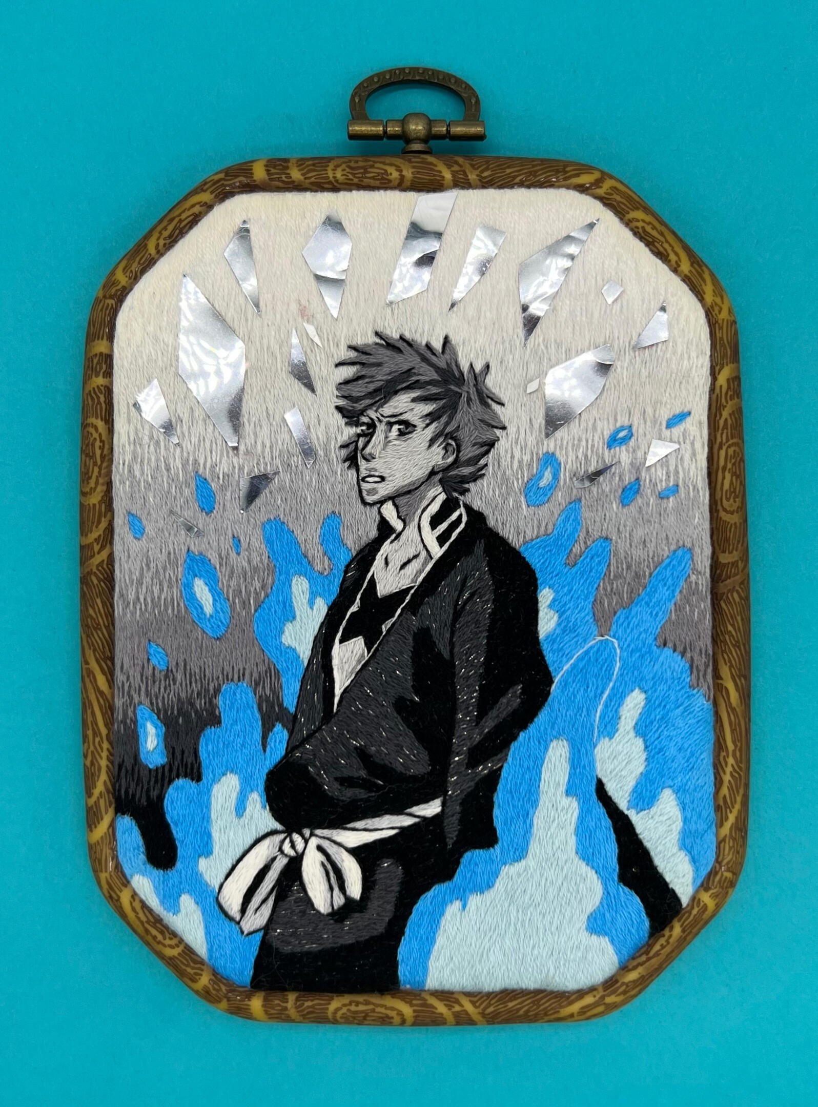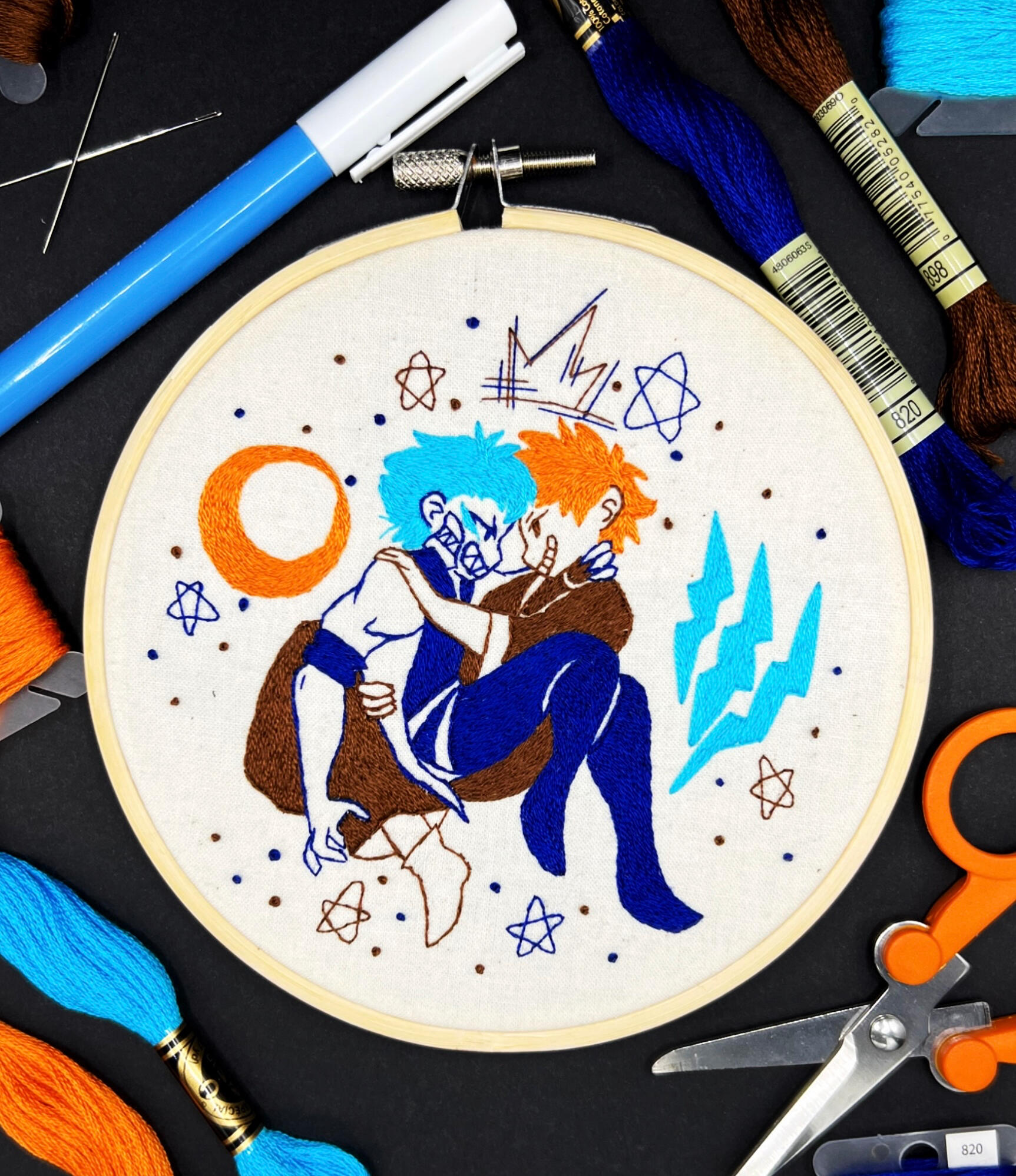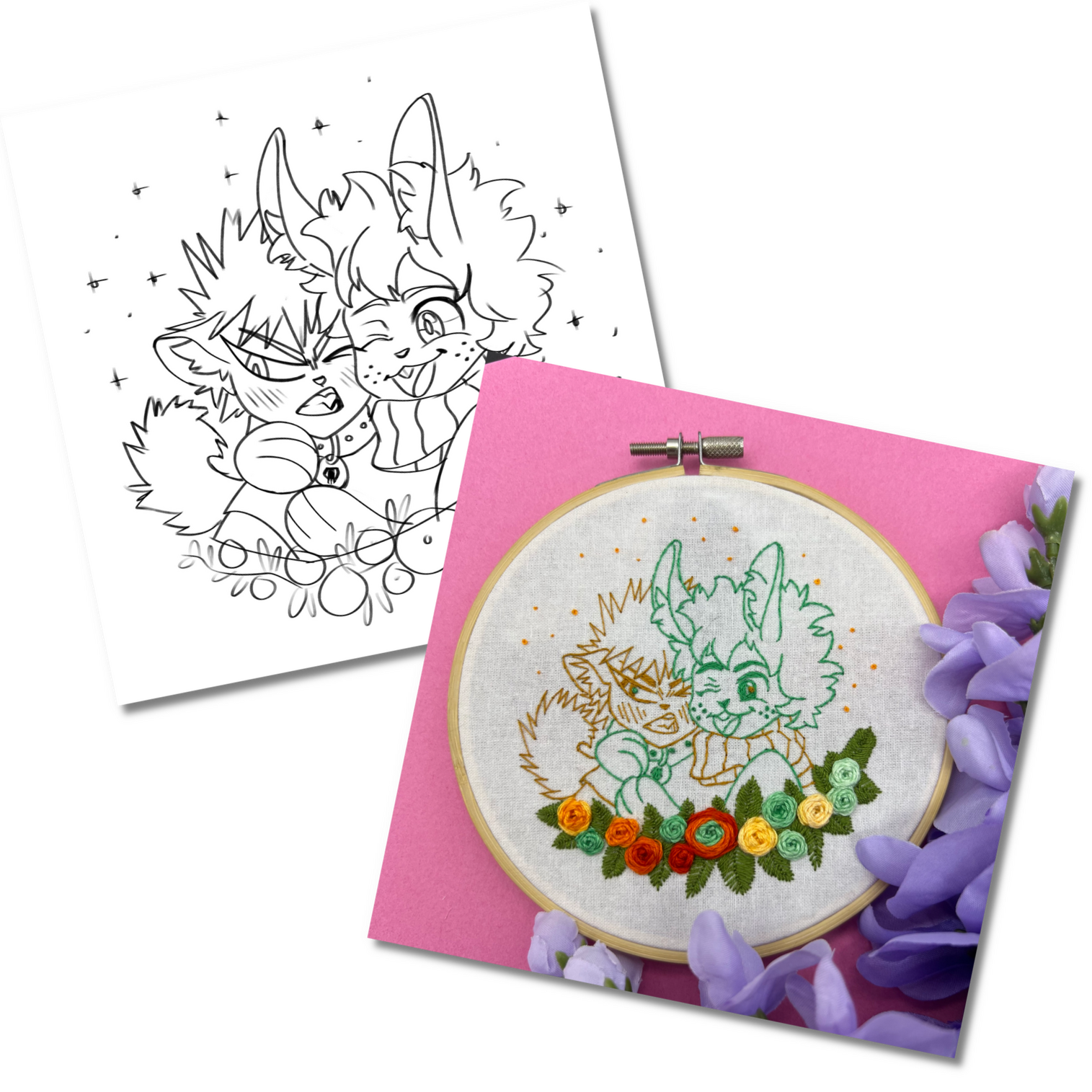Hand embroidered hoops of lineart busts with multicolored pin-wheel flowers added to frame the characters. The default color of the lineart is black while the colors of the flowers a picked based on the color palettes of the characters. Requests for different colors can be made for lineart and flowers for no additional cost.
