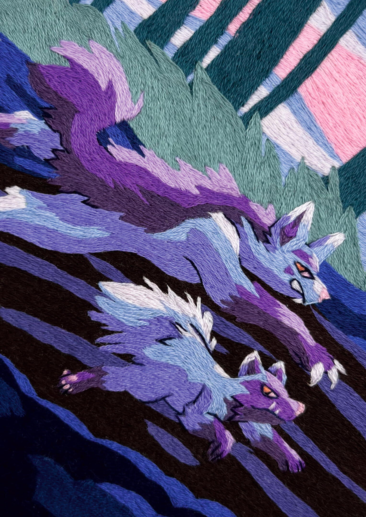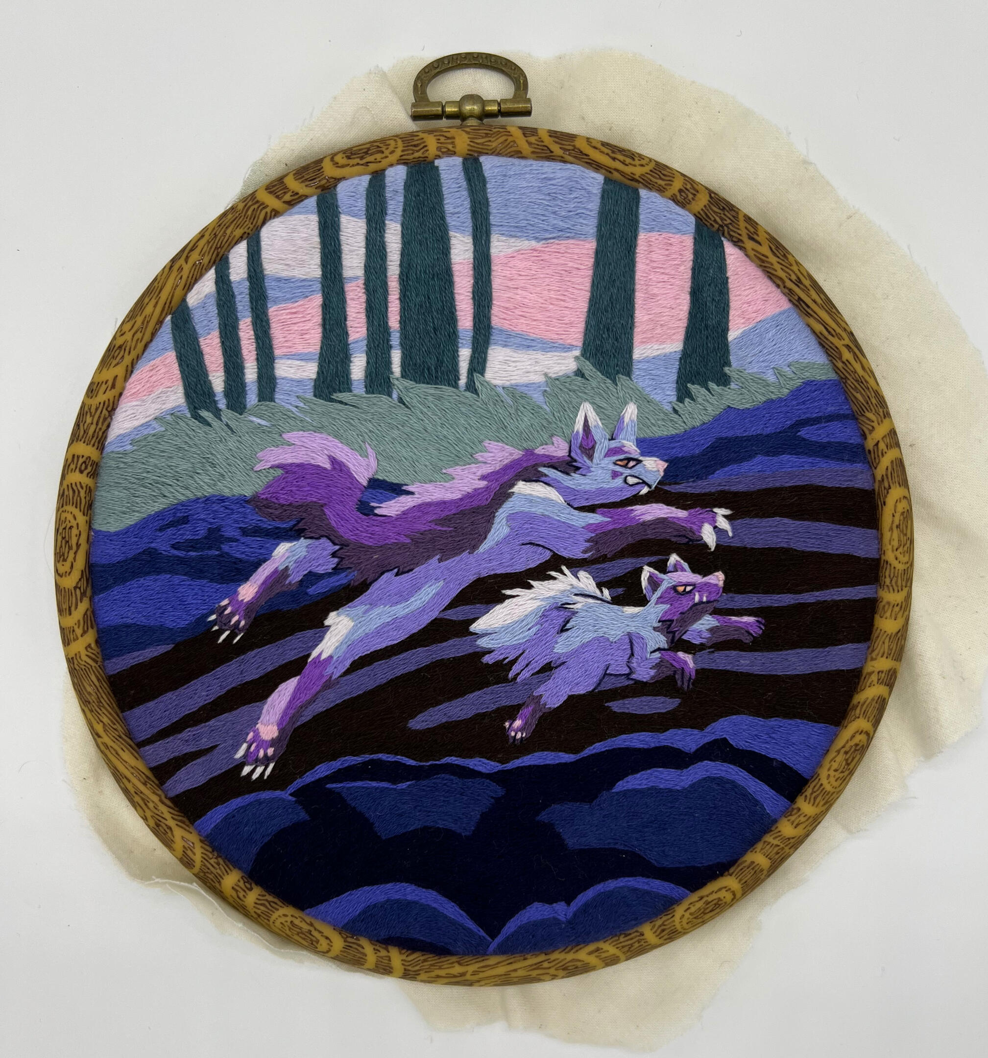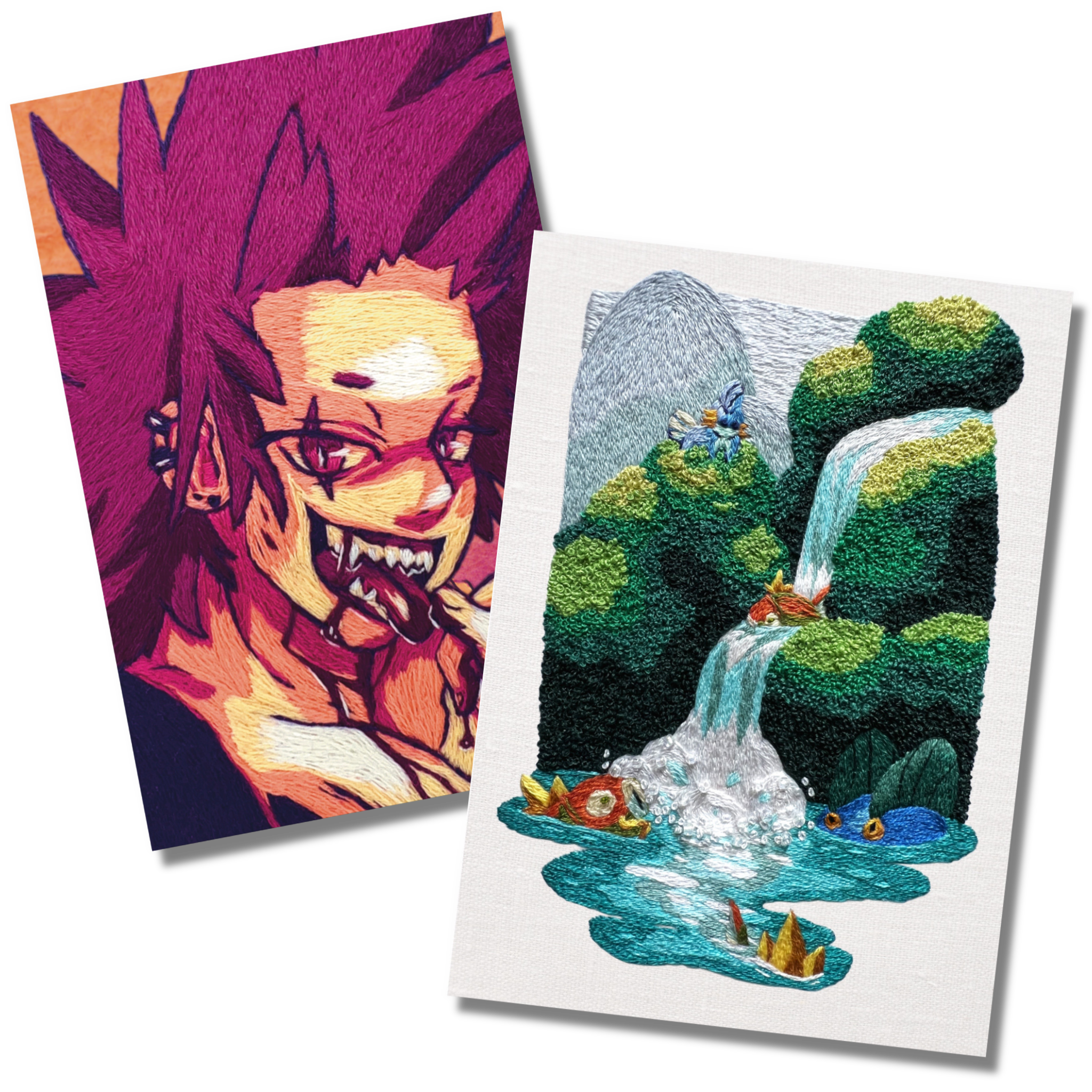 An embroidered full illustration. Sometimes other types of medias are mixed in for certain effects such as felt, fabric collaging, beading, watercolor and other paints.