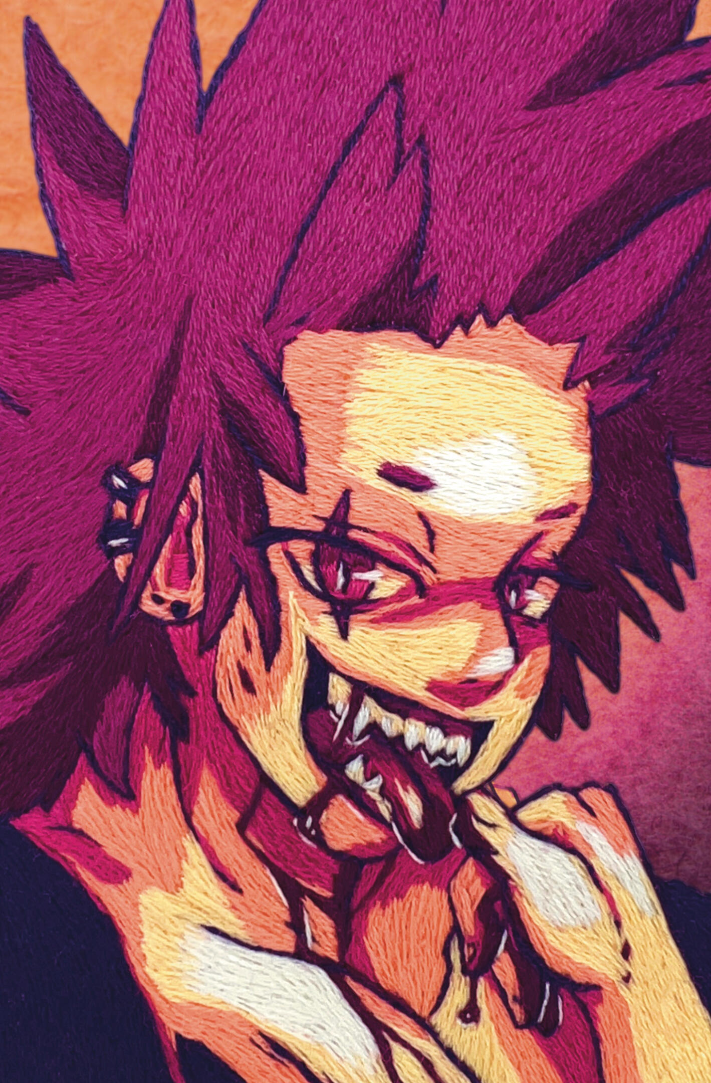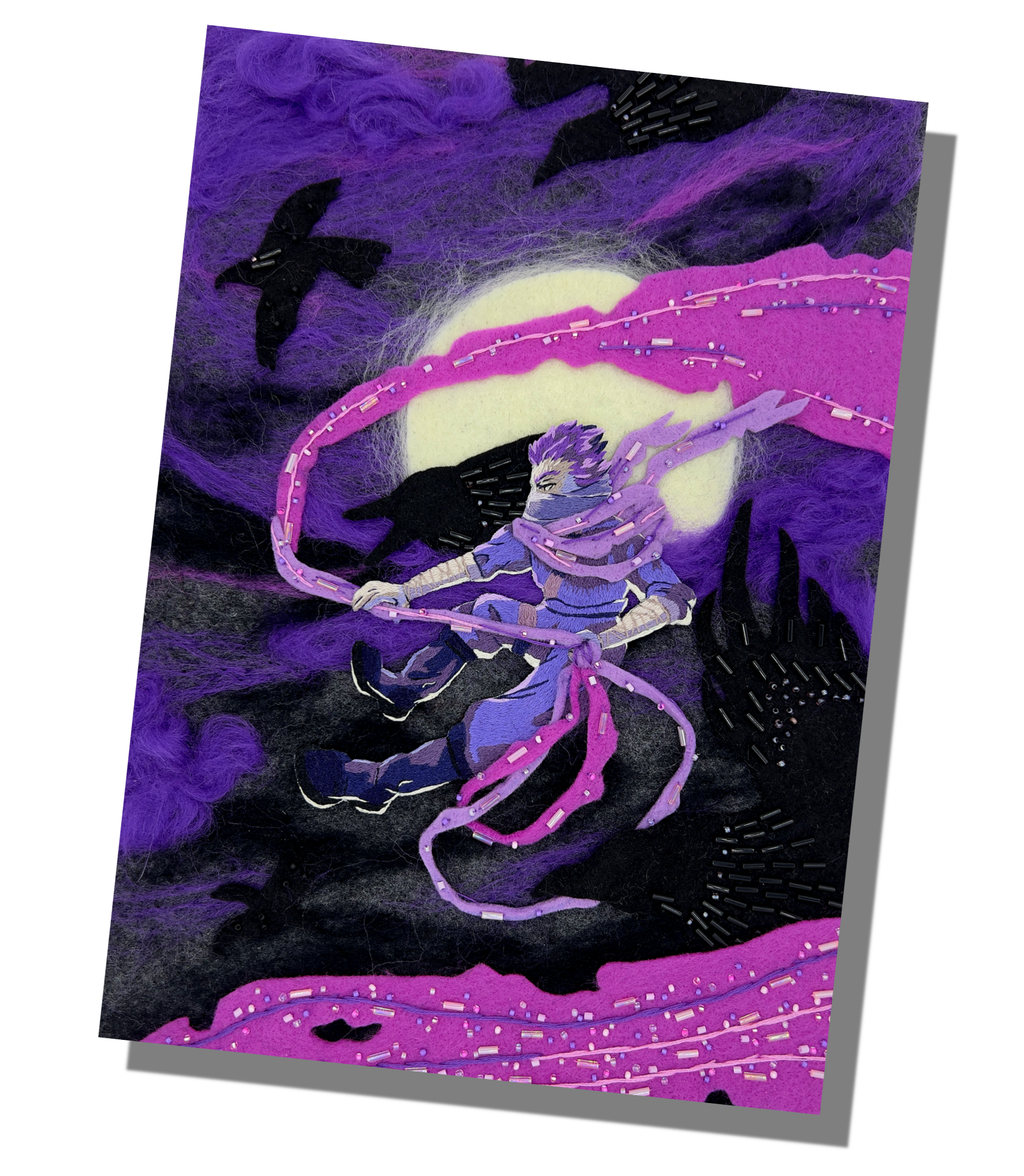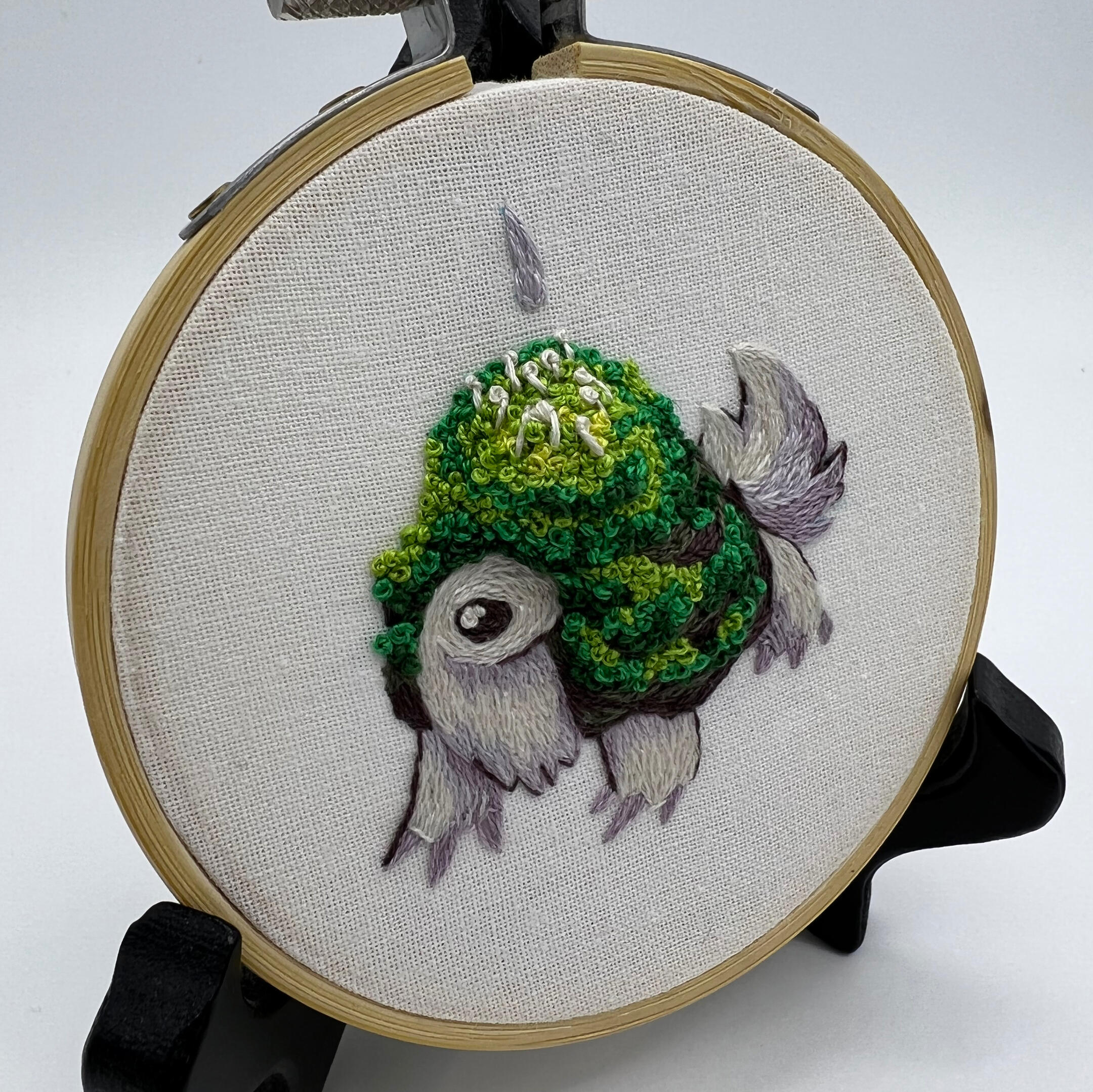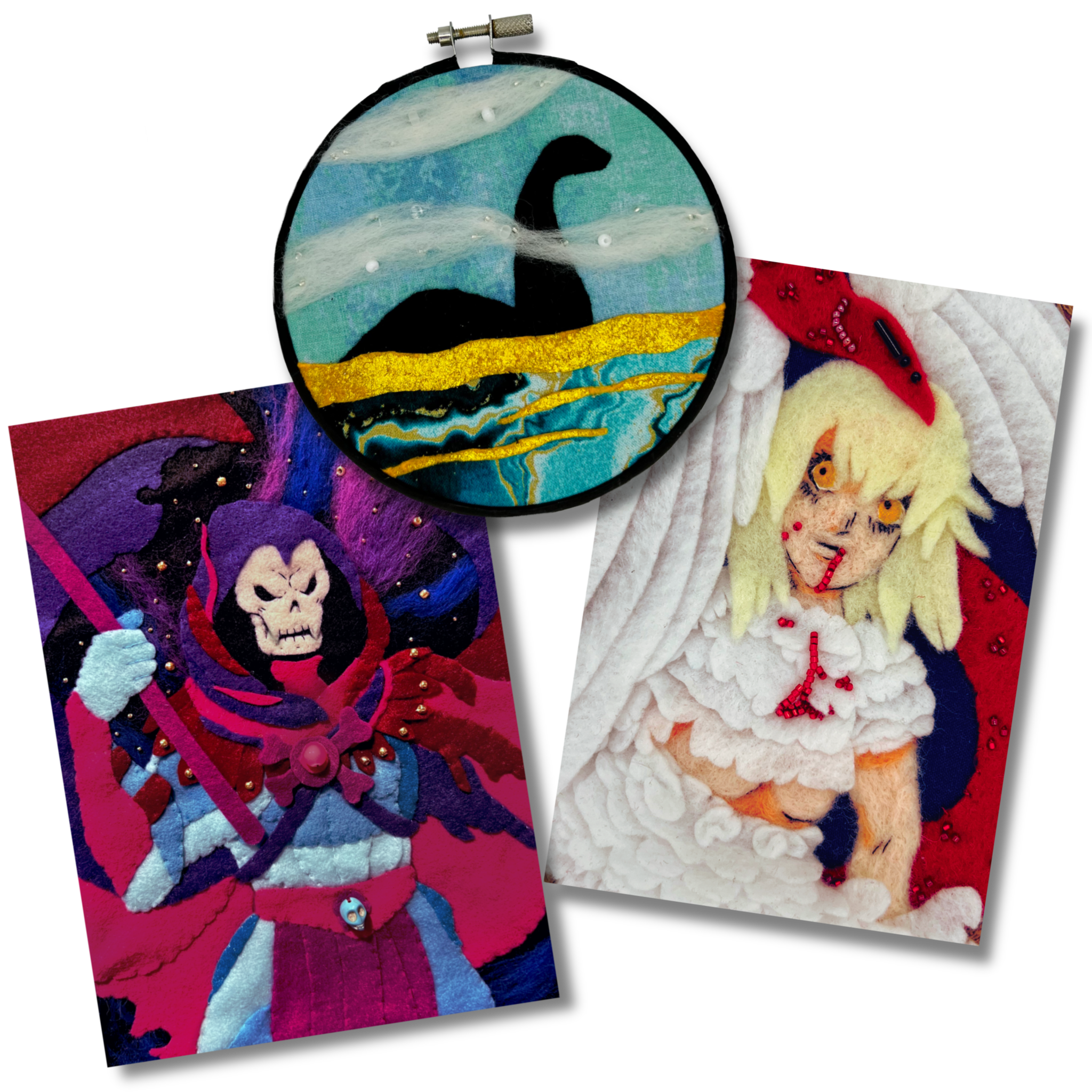 An embroidered full illustration. Sometimes other types of medias are mixed in for certain effects such as felt, fabric collaging, beading, watercolor and other paints.