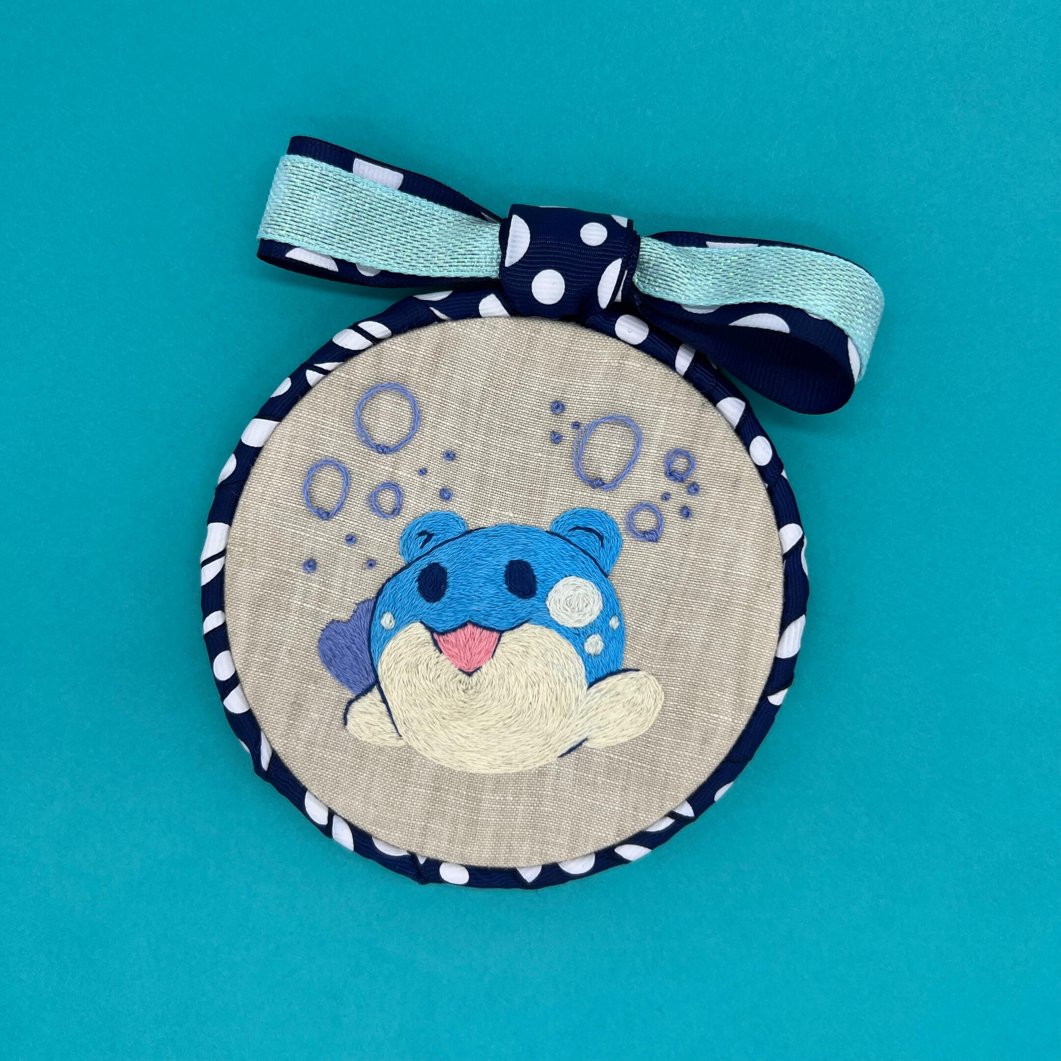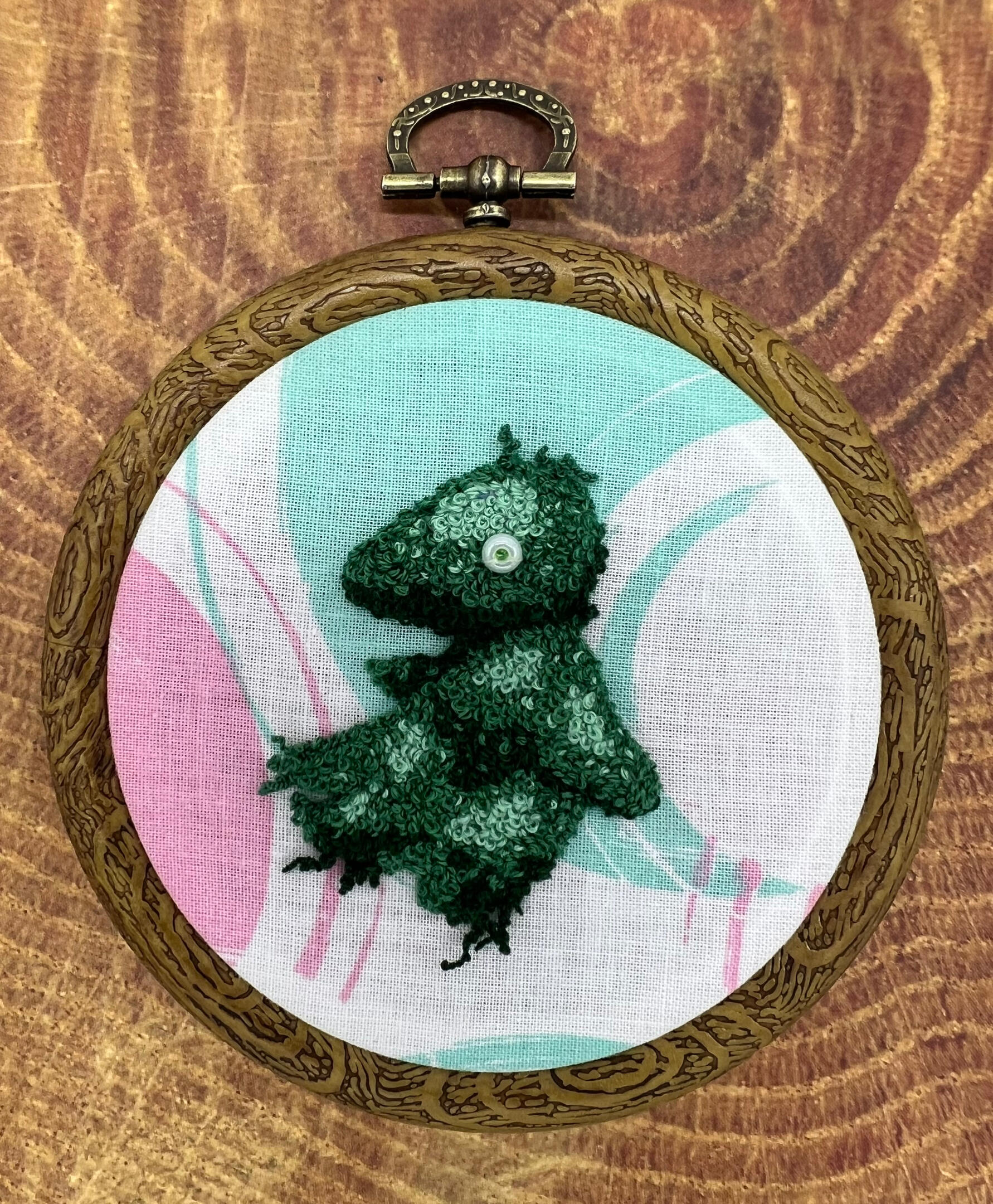 An embroidered hoop of a single or of multiple characters with no stitched background detailed. Playful patterned fabrics may be used depending on the theme and availability.