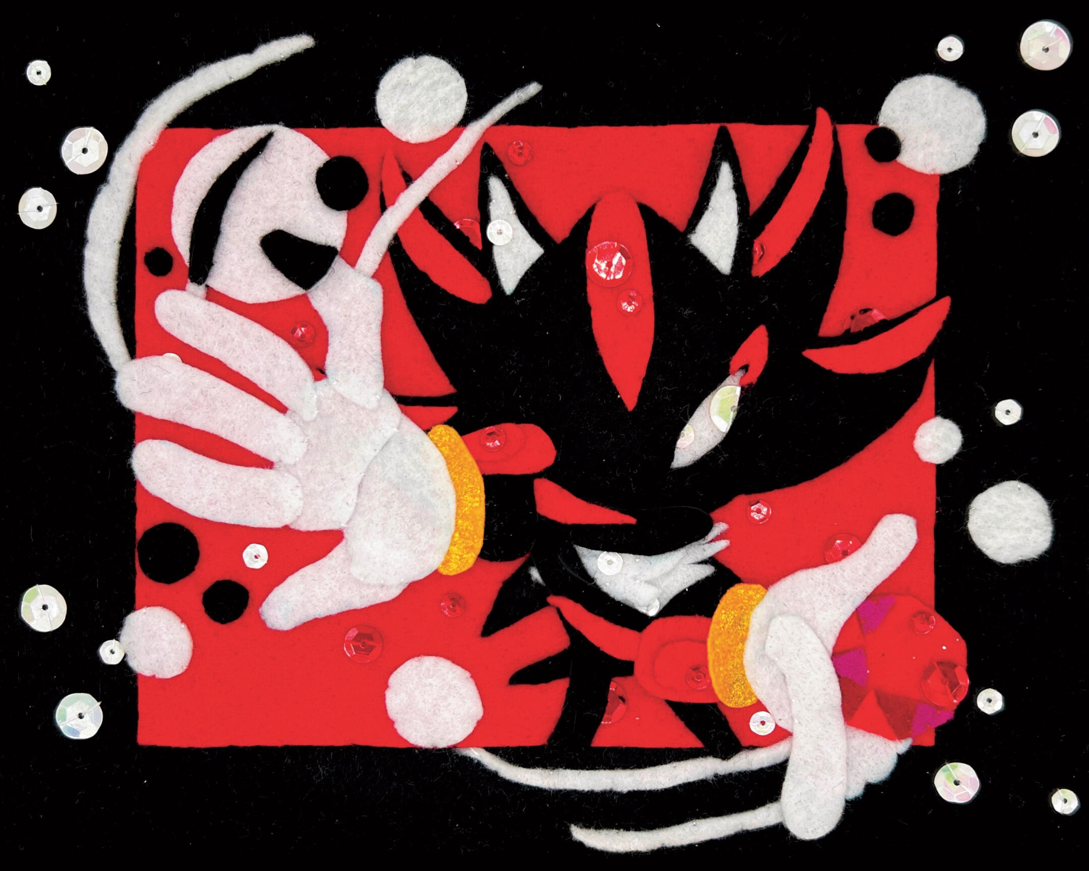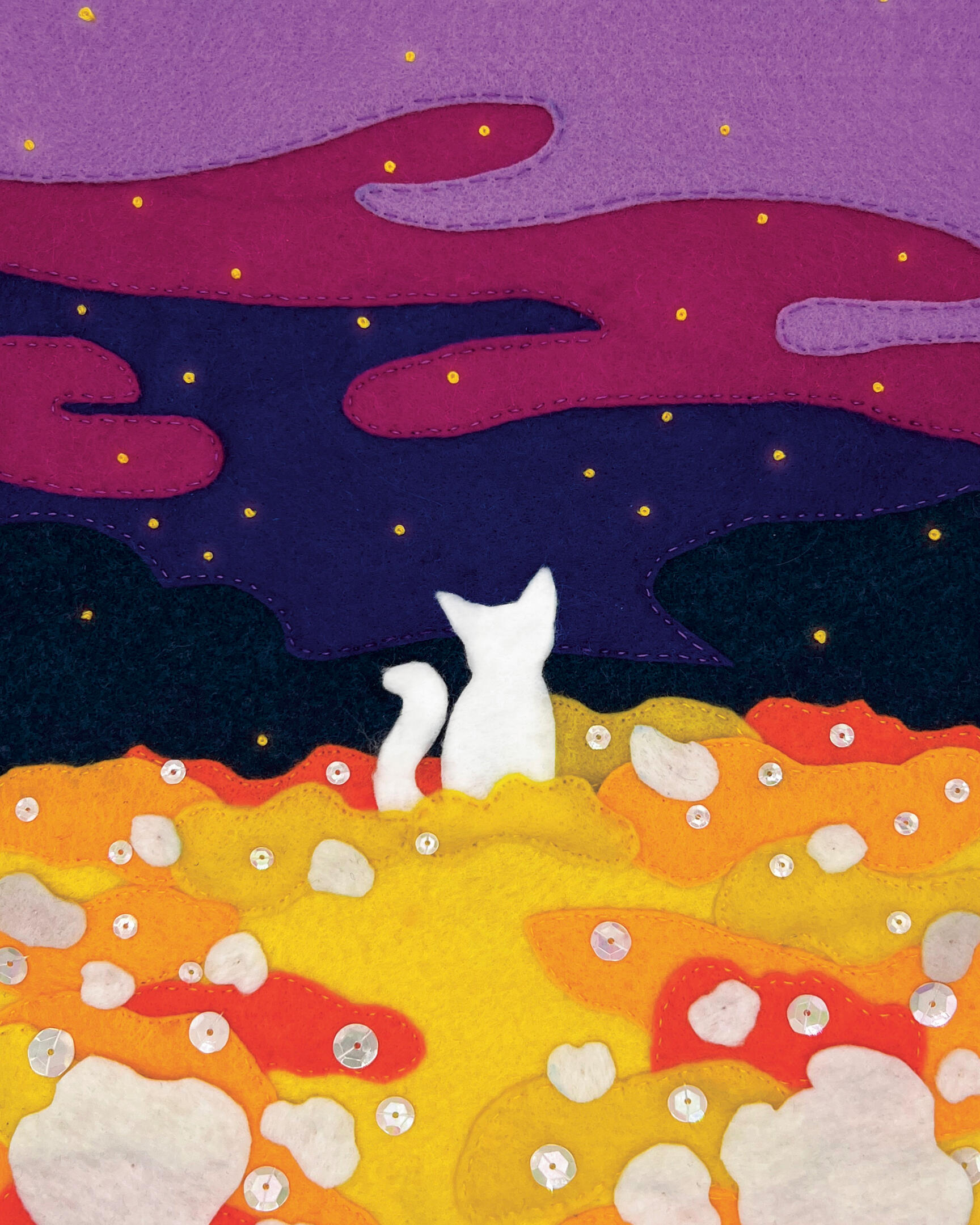 Art created with the use of layering and stitching together felt onto fabric.